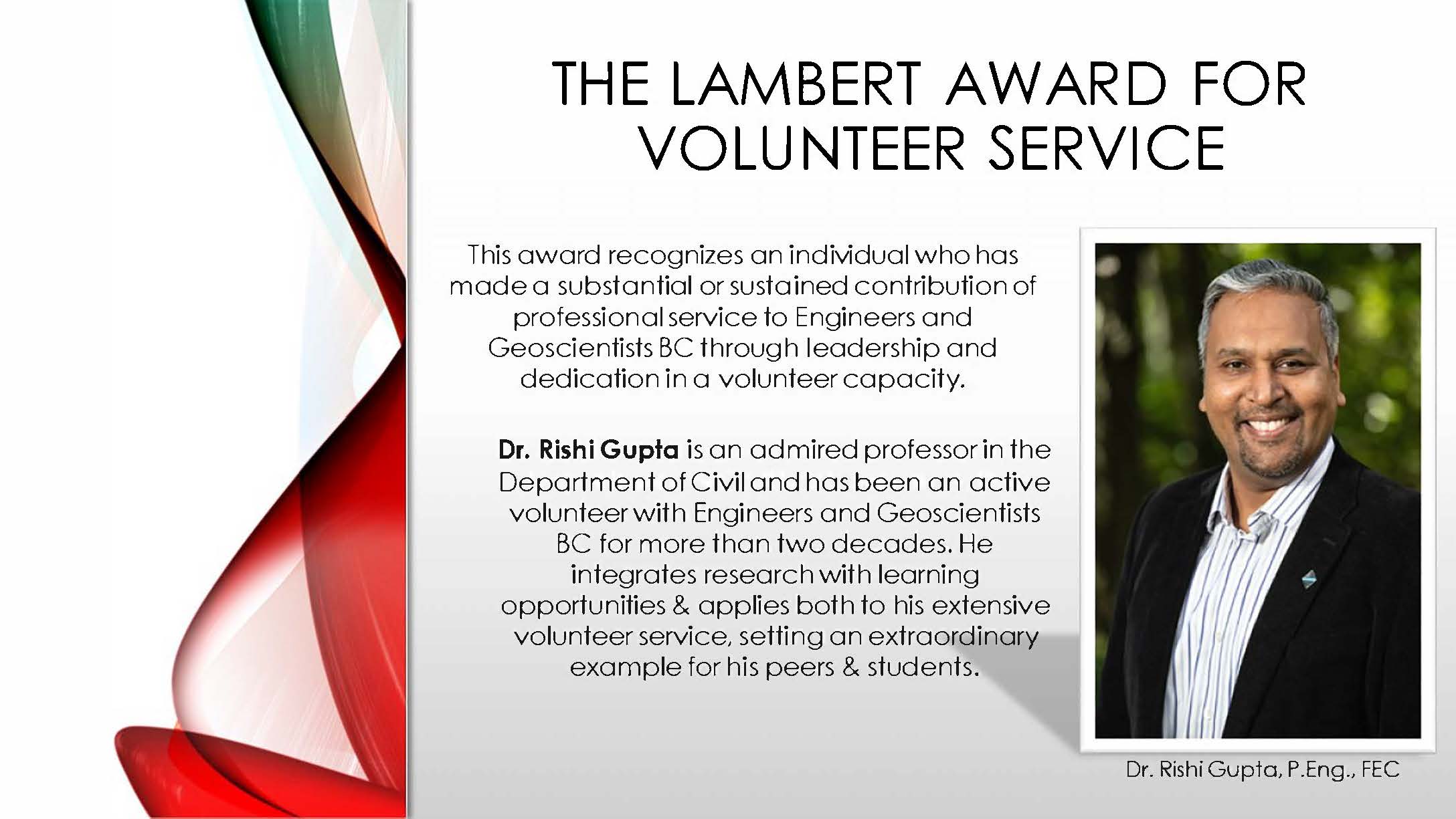 Dr. Rishi Gupta is an admired professor in the Department of Civil and has been an active volunteer with Engineers and Geoscientists BC for more than two decades. He integrates research with learning opportunities & applies both to his extensive volunteer service, setting an extraordinary example for his peers & students.