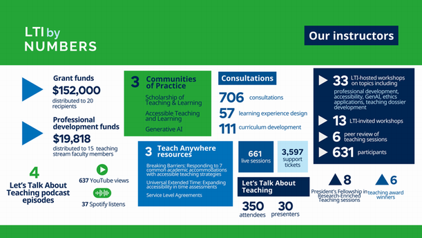We also undertook a significant rebranding initiative, renaming our division to Learning and Teaching Innovation, and updating our team portfolios to better reflect our focus and values. The Centre for Academic Communication was renamed Academic Skills Centre. We welcomed new staff with expertise in pedagogical approaches to large enrollment courses, STEM, data analysis, and academic integrity—areas that are increasingly central to our work.