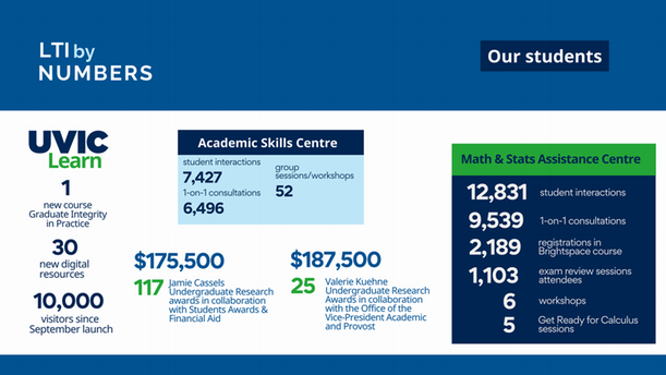 We continued to expand our support for students and faculty alike. Highlights include the addition of a new graduate student–focused module to our Integrity in Practice Brightspace course series to accompany last years’ redesign of the undergraduate module, the VKURA symposium was reimagined with the addition of a 3-Minute Thesis presentation opportunity for participants, and the redesign of our faculty institute of teaching program, now known as the Learning Innovation for Teaching (LIFT) program, which has already seen strong engagement.