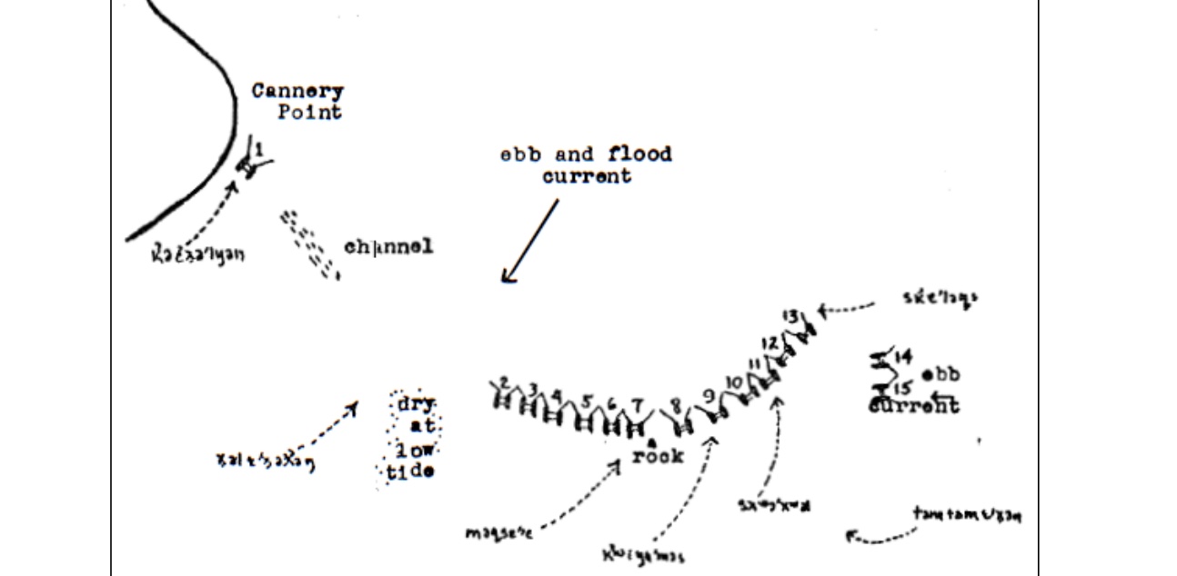 Late-19th Century Reef Net Fishing Locations at SMOKEĆ (Point Roberts) (Suttles 1974:209). Owner of each location can be found in Figure 1. of Fritz' thesis.